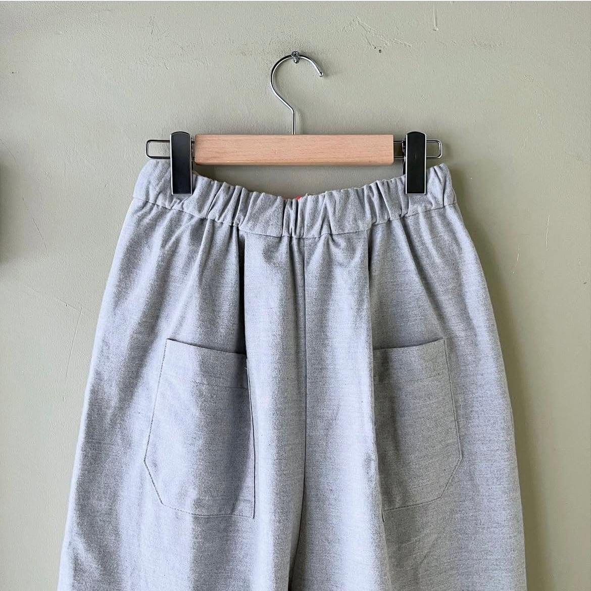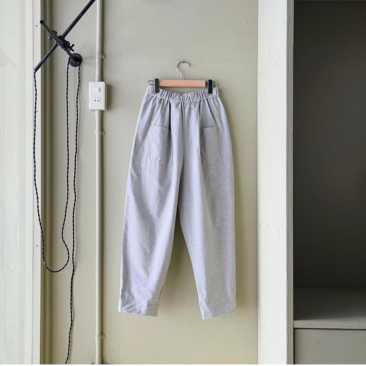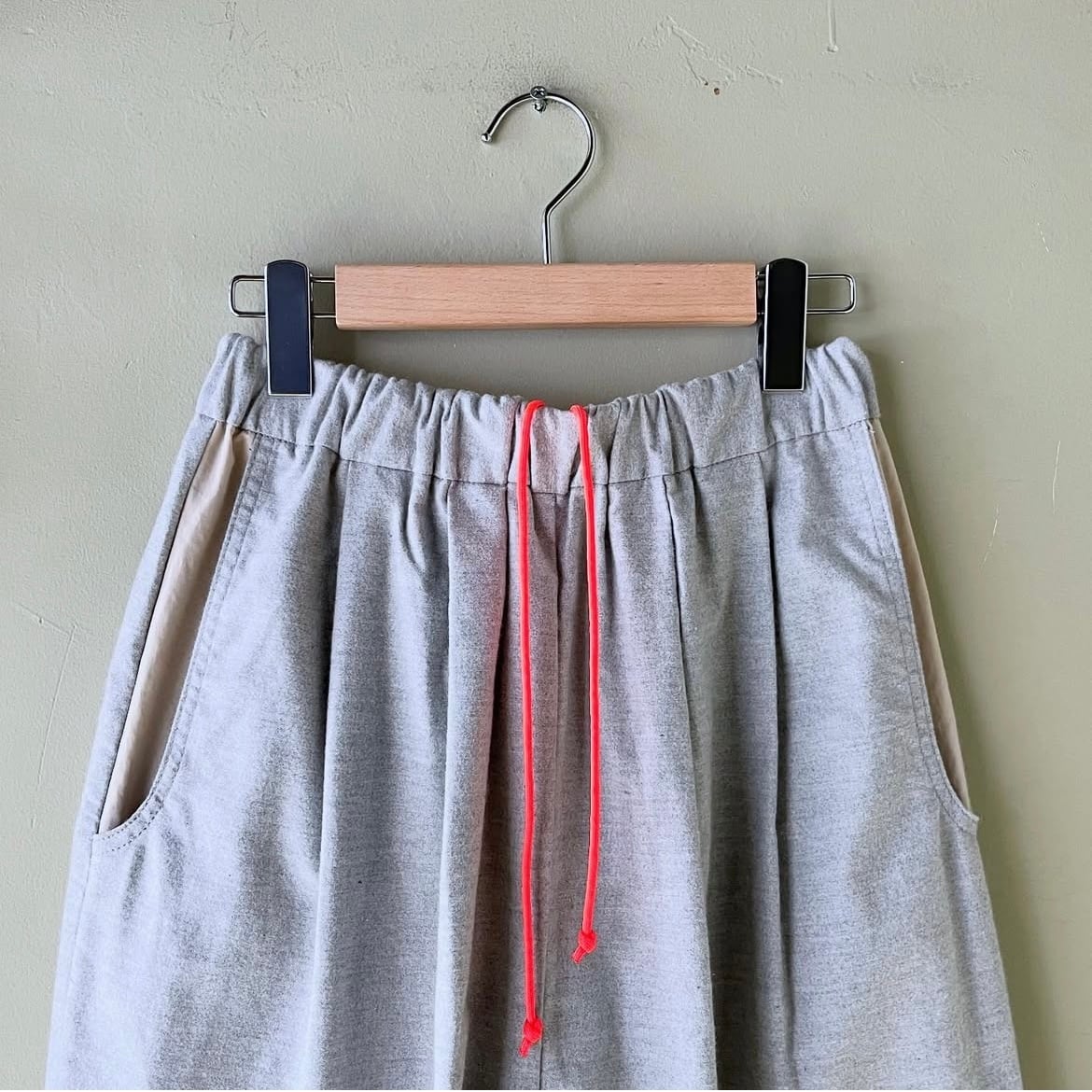 フロントのポケットの袋布、裾裏、ウェスト裏は配色のサラッとしたコットンナイロン素材を使っていて、色はもちろんふわっとしたコットンフラノとのコントラストもポイントになります。