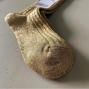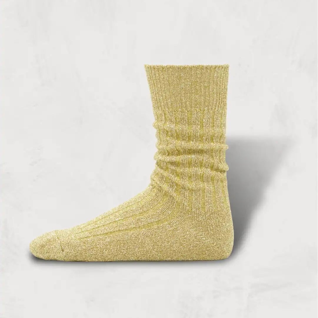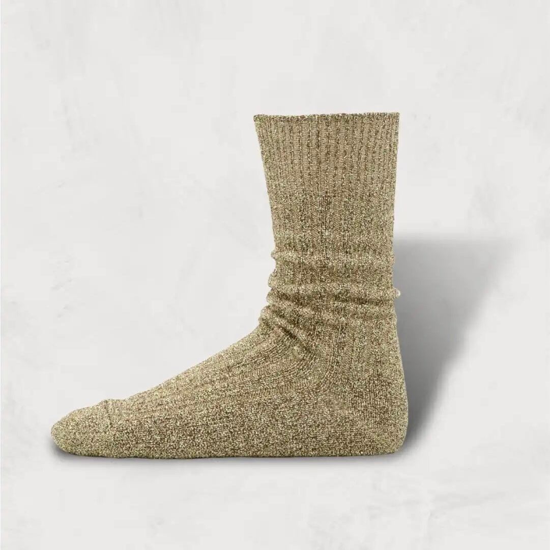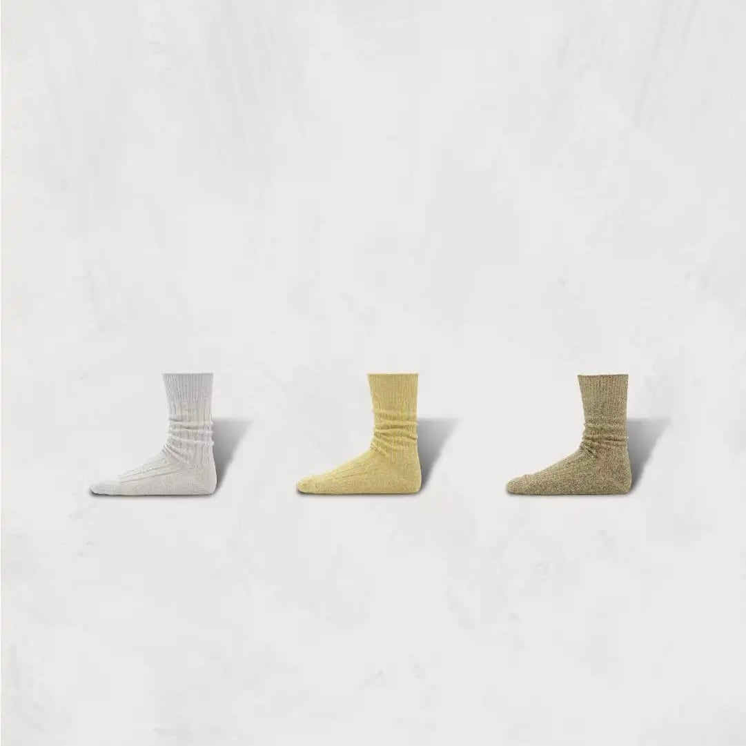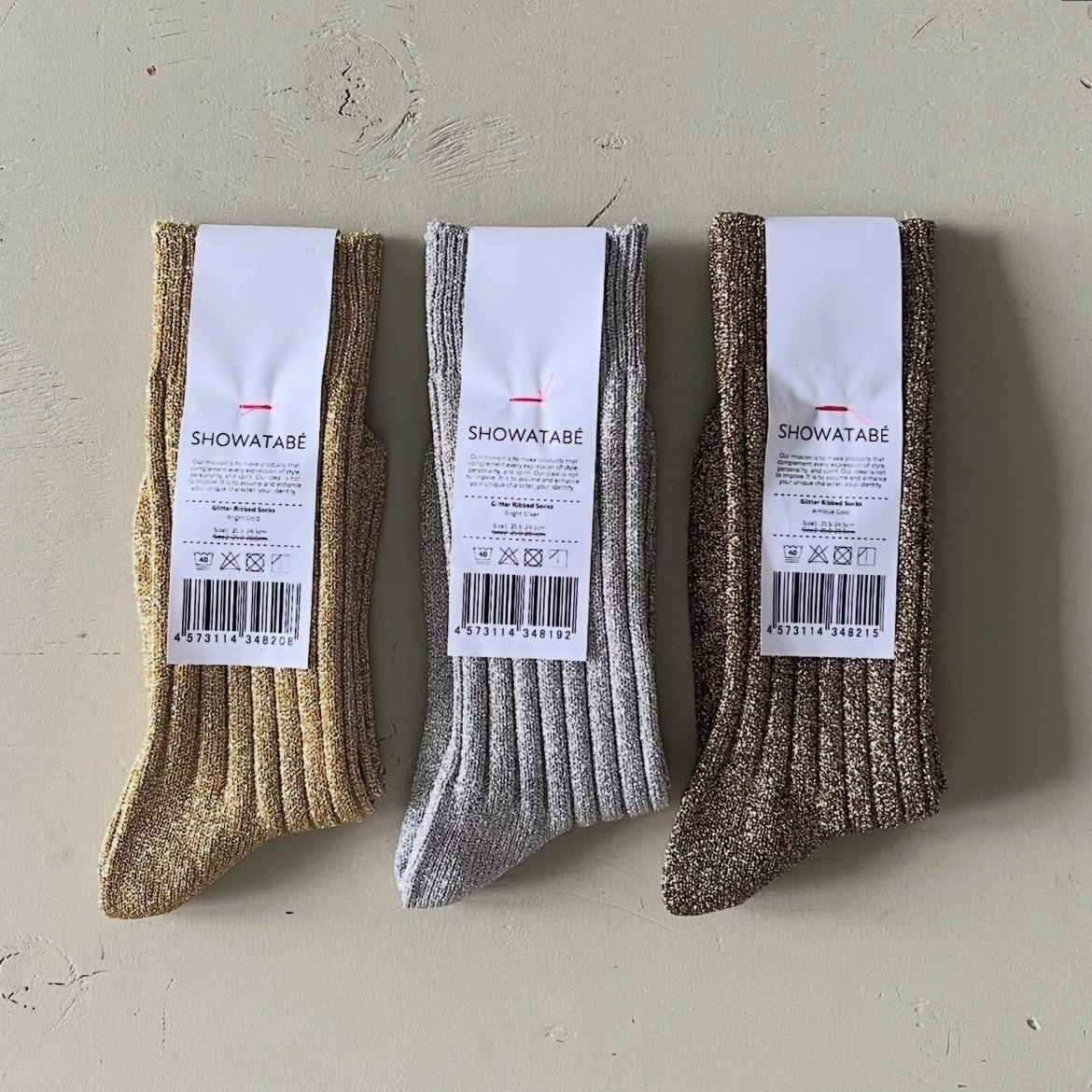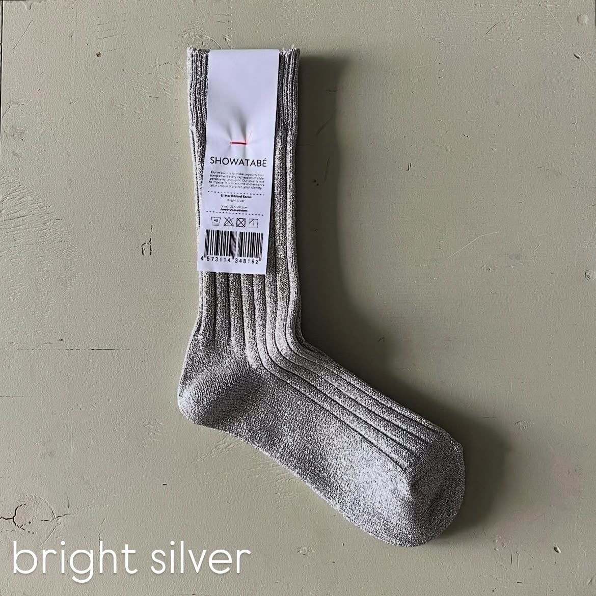 中空構造のラメ糸(糸の中心に空洞を持つ特殊な構造の糸。軽量で強度があり、チクチク感もありません)で編み立てた軽量で美しいリブソックス。